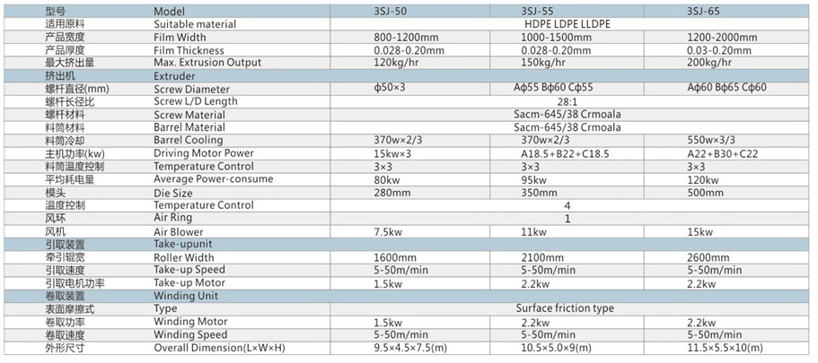 本机组使用于LDPE, LLDPE. HDPE等塑料原料。 用于生产复合膜基材、液体膜、收缩膜、保护膜,电缆膜、高分子粘接膜、多功能工业包装膜等高品质塑料包装薄膜,能更好地满足高精度:高速度彩印、复合、涂覆制品的使用要求。