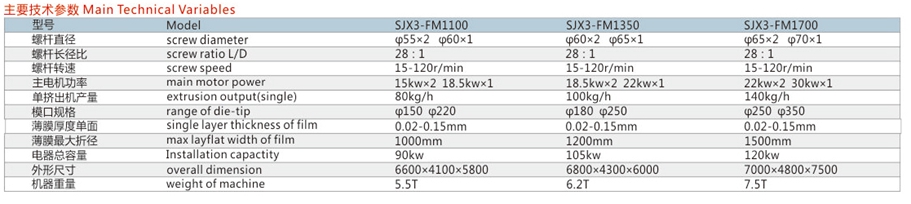 三层塑料共挤吹塑复合膜机组是我厂根据市场需要而研制的,在设计结构上吸收了国内外同类产品先进水平。它用平挤上吹法可连续吹制折幅宽度为800/1500毫米,厚度为0.08毫米的各种LDPE、HDPE.LLDPE、MLLDPE. PA包装膜。这种膜由于其阻隔性好、保湿、防湿、防风、防霜冻、隔氧、耐油,因此可广泛用于轻重包装,如各种鲜果、肉食品,酱菜、鲜牛奶.液体饮料等。